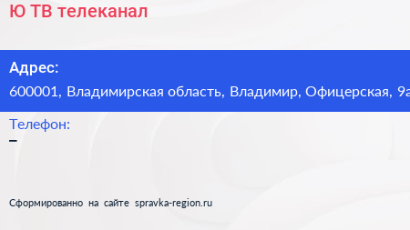 Ю ТВ, телеканал по адресу 600001, Владимирская область, Владимир, Офицерская, 9а в дальнейшем Организация, размещена в следующих категориях: