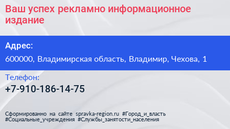 Ваш успех, рекламно-информационное издание по адресу 600000, Владимирская область, Владимир, Чехова, 1 в дальнейшем Организация, размещена в следующих категориях: