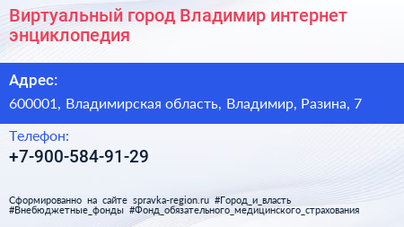 Виртуальный город Владимир, интернет-энциклопедия по адресу 600001, Владимирская область, Владимир, Разина, 7 в дальнейшем Организация, размещена в следующих категориях: