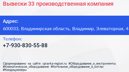 Вывески 33, производственная компания по адресу 600033, Владимирская область, Владимир, Элеваторная, 4 в дальнейшем Организация, размещена в следующих категориях: