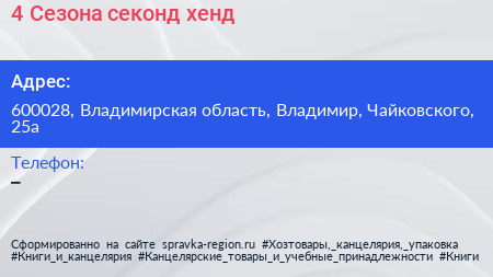 4 Сезона, секонд-хенд по адресу 600028, Владимирская область, Владимир, Чайковского, 25а в дальнейшем Организация, размещена в следующих категориях: