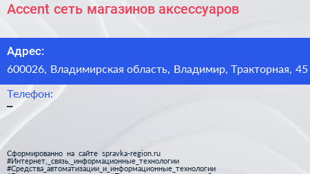 Accent, сеть магазинов аксессуаров по адресу 600026, Владимирская область, Владимир, Тракторная, 45 в дальнейшем Организация, размещена в следующих категориях: