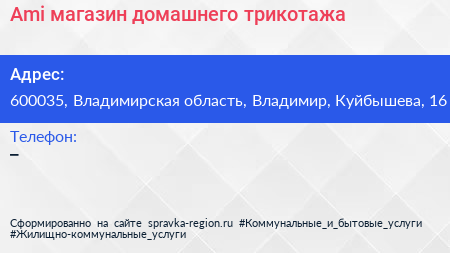 Ami, магазин домашнего трикотажа по адресу 600035, Владимирская область, Владимир, Куйбышева, 16 в дальнейшем Организация, размещена в следующих категориях: