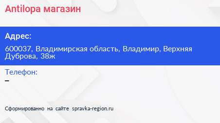 Antilopa, магазин по адресу 600037, Владимирская область, Владимир, Верхняя Дуброва, 38ж в дальнейшем Организация, размещена в следующих категориях: