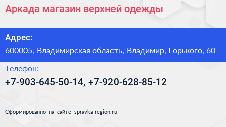 Аркада, магазин верхней одежды по адресу 600005, Владимирская область, Владимир, Горького, 60 в дальнейшем Организация, размещена в следующих категориях: