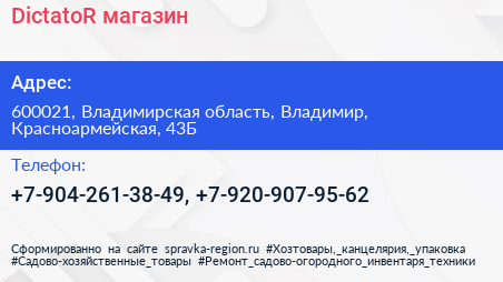 DictatoR, магазин по адресу 600021, Владимирская область, Владимир, Красноармейская, 43Б в дальнейшем Организация, размещена в следующих категориях: