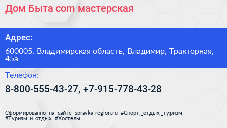 Дом Быта.com, мастерская по адресу 600005, Владимирская область, Владимир, Тракторная, 45а в дальнейшем Организация, размещена в следующих категориях: