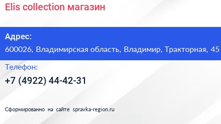 Elis collection, магазин по адресу 600026, Владимирская область, Владимир, Тракторная, 45 в дальнейшем Организация, размещена в следующих категориях: