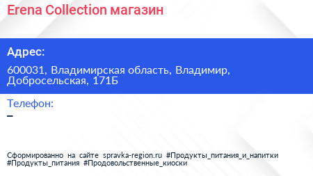 Erena Collection, магазин по адресу 600031, Владимирская область, Владимир, Добросельская, 171Б в дальнейшем Организация, размещена в следующих категориях:
