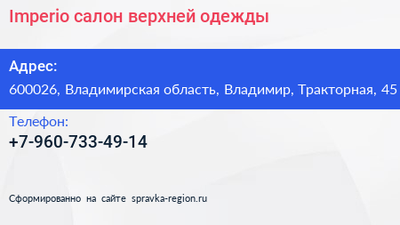 Imperio, салон верхней одежды по адресу 600026, Владимирская область, Владимир, Тракторная, 45 в дальнейшем Организация, размещена в следующих категориях: