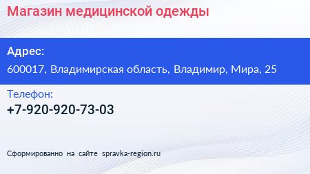Магазин медицинской одежды по адресу 600017, Владимирская область, Владимир, Мира, 25 в дальнейшем Организация, размещена в следующих категориях: