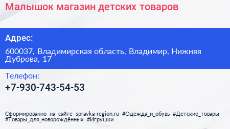 Малышок, магазин детских товаров по адресу 600037, Владимирская область, Владимир, Нижняя Дуброва, 17 в дальнейшем Организация, размещена в следующих категориях: