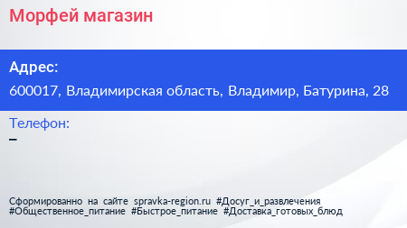 Морфей, магазин по адресу 600017, Владимирская область, Владимир, Батурина, 28 в дальнейшем Организация, размещена в следующих категориях: