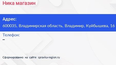 Ника, магазин по адресу 600035, Владимирская область, Владимир, Куйбышева, 16 в дальнейшем Организация, размещена в следующих категориях: