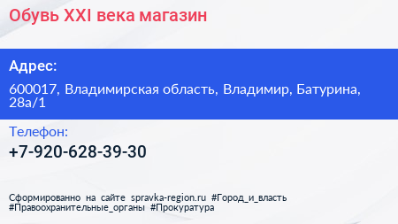 Обувь XXI века, магазин по адресу 600017, Владимирская область, Владимир, Батурина, 28а/1 в дальнейшем Организация, размещена в следующих категориях: