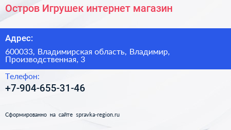 Остров Игрушек, интернет-магазин по адресу 600033, Владимирская область, Владимир, Производственная, 3 в дальнейшем Организация, размещена в следующих категориях: