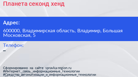 Планета, секонд-хенд по адресу 600000, Владимирская область, Владимир, Большая Московская, 5 в дальнейшем Организация, размещена в следующих категориях: