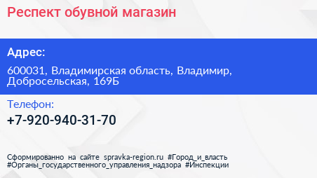 Респект, обувной магазин по адресу 600031, Владимирская область, Владимир, Добросельская, 169Б в дальнейшем Организация, размещена в следующих категориях: