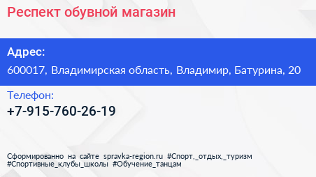 Респект, обувной магазин по адресу 600017, Владимирская область, Владимир, Батурина, 20 в дальнейшем Организация, размещена в следующих категориях: