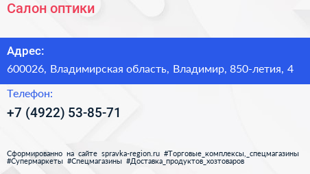 Салон оптики по адресу 600026, Владимирская область, Владимир, 850-летия, 4 в дальнейшем Организация, размещена в следующих категориях: