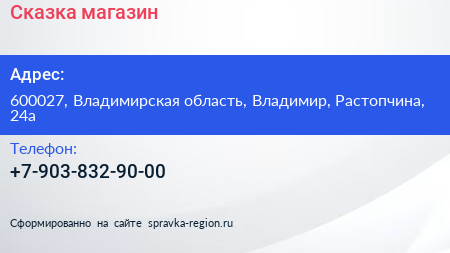 Сказка, магазин по адресу 600027, Владимирская область, Владимир, Растопчина, 24а в дальнейшем Организация, размещена в следующих категориях: