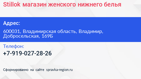 Stillok, магазин женского нижнего белья по адресу 600031, Владимирская область, Владимир, Добросельская, 169Б в дальнейшем Организация, размещена в следующих категориях: