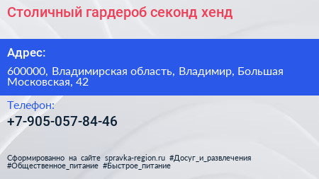 Столичный гардероб, секонд-хенд по адресу 600000, Владимирская область, Владимир, Большая Московская, 42 в дальнейшем Организация, размещена в следующих категориях: