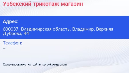 Узбекский трикотаж, магазин по адресу 600037, Владимирская область, Владимир, Верхняя Дуброва, 44 в дальнейшем Организация, размещена в следующих категориях: