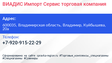 ВИАДИС Импорт Сервис, торговая компания по адресу 600035, Владимирская область, Владимир, Куйбышева, 20а в дальнейшем Организация, размещена в следующих категориях: