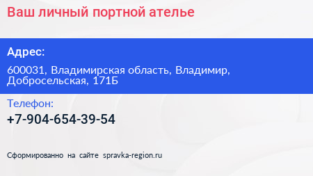 Ваш личный портной, ателье по адресу 600031, Владимирская область, Владимир, Добросельская, 171Б в дальнейшем Организация, размещена в следующих категориях: