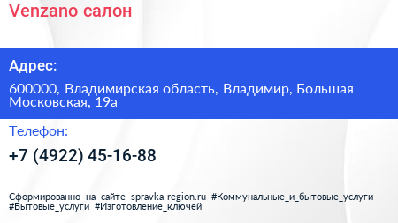 Venzano, салон по адресу 600000, Владимирская область, Владимир, Большая Московская, 19а в дальнейшем Организация, размещена в следующих категориях: