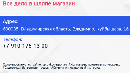 Все дело в шляпе, магазин по адресу 600035, Владимирская область, Владимир, Куйбышева, 16 в дальнейшем Организация, размещена в следующих категориях: