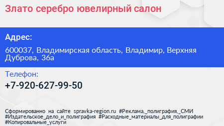 Злато-серебро, ювелирный салон по адресу 600037, Владимирская область, Владимир, Верхняя Дуброва, 36а в дальнейшем Организация, размещена в следующих категориях: