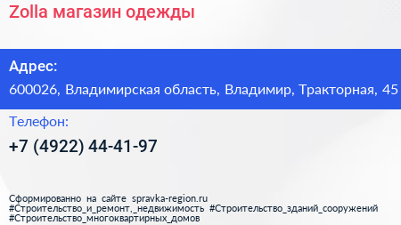 Zolla, магазин одежды по адресу 600026, Владимирская область, Владимир, Тракторная, 45 в дальнейшем Организация, размещена в следующих категориях: