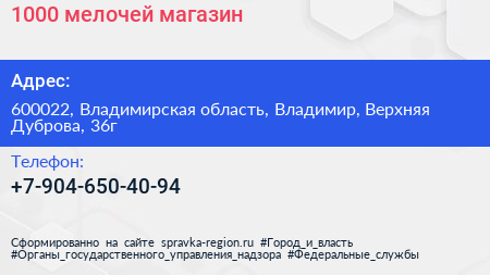1000 мелочей, магазин по адресу 600022, Владимирская область, Владимир, Верхняя Дуброва, 36г в дальнейшем Организация, размещена в следующих категориях: