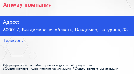 Amway, компания по адресу 600017, Владимирская область, Владимир, Батурина, 33 в дальнейшем Организация, размещена в следующих категориях: