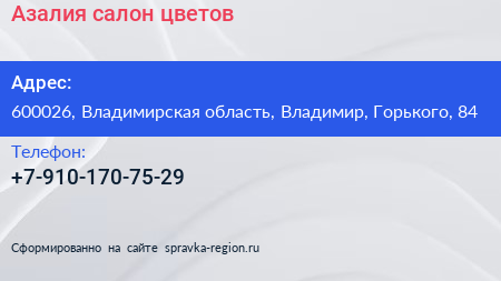 Азалия, салон цветов по адресу 600026, Владимирская область, Владимир, Горького, 84 в дальнейшем Организация, размещена в следующих категориях: