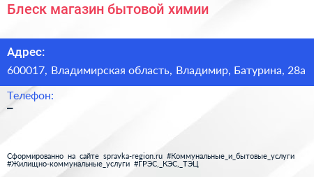 Блеск, магазин бытовой химии по адресу 600017, Владимирская область, Владимир, Батурина, 28а в дальнейшем Организация, размещена в следующих категориях: