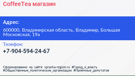 CoffeeTea, магазин по адресу 600000, Владимирская область, Владимир, Большая Московская, 19а в дальнейшем Организация, размещена в следующих категориях:
