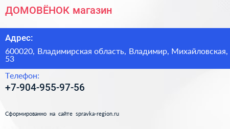 ДОМОВЁНОК, магазин по адресу 600020, Владимирская область, Владимир, Михайловская, 53 в дальнейшем Организация, размещена в следующих категориях: