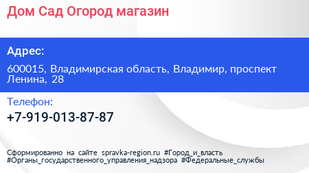 Дом-Сад-Огород, магазин по адресу 600015, Владимирская область, Владимир, проспект Ленина, 28 в дальнейшем Организация, размещена в следующих категориях: