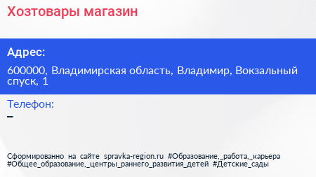 Хозтовары, магазин по адресу 600000, Владимирская область, Владимир, Вокзальный спуск, 1 в дальнейшем Организация, размещена в следующих категориях: