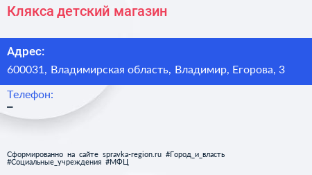 Клякса, детский магазин по адресу 600031, Владимирская область, Владимир, Егорова, 3 в дальнейшем Организация, размещена в следующих категориях: