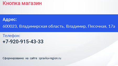 Кнопка, магазин по адресу 600023, Владимирская область, Владимир, Песочная, 17а в дальнейшем Организация, размещена в следующих категориях: