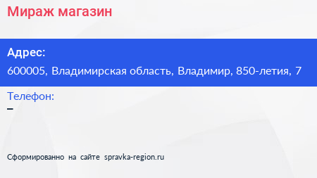 Мираж, магазин по адресу 600005, Владимирская область, Владимир, 850-летия, 7 в дальнейшем Организация, размещена в следующих категориях: