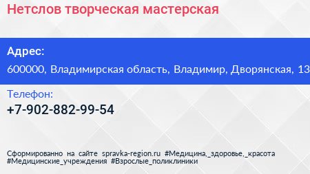 Нетслов, творческая мастерская по адресу 600000, Владимирская область, Владимир, Дворянская, 13 в дальнейшем Организация, размещена в следующих категориях: