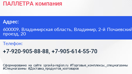 ПАЛЛЕТРА, компания по адресу 600009, Владимирская область, Владимир, 2-й Почаевский проезд, 20 в дальнейшем Организация, размещена в следующих категориях: