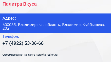 Палитра Вкуса по адресу 600035, Владимирская область, Владимир, Куйбышева, 20а в дальнейшем Организация, размещена в следующих категориях: