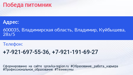 Победа, питомник по адресу 600035, Владимирская область, Владимир, Куйбышева, 28з/5 в дальнейшем Организация, размещена в следующих категориях: