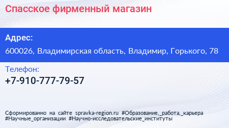 Спасское, фирменный магазин по адресу 600026, Владимирская область, Владимир, Горького, 78 в дальнейшем Организация, размещена в следующих категориях: